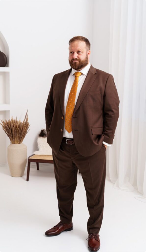 Személyre szabva a comfort fit öltöny pontosan követi a viselő adottságait: a zakó enyhén hosszabb, hogy optikailag kiegyenlítse a felsőtest arányait, a vállat strukturálja, a derékvonalnál pedig kellő bőséget ad, így nem szorít, de nem is takar túlzottan. A végeredmény egy magabiztos, rendezett és kényelmes megjelenés, amelyben a viselő nemcsak jól néz ki, de valóban jól is érzi magát.